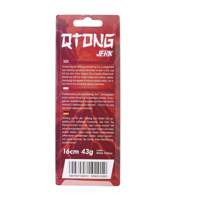 Przedstawiamy przynętę Qtong Jerk- przyciągający wzrok wobler stworzony do płytkiego łowienia. Ta wyjątkowo ukształtowana przynęta wyróżnia się żywymi kolorami i realistycznymi detalami- którym nie oprą się nawet najtłustsze mamuśki!